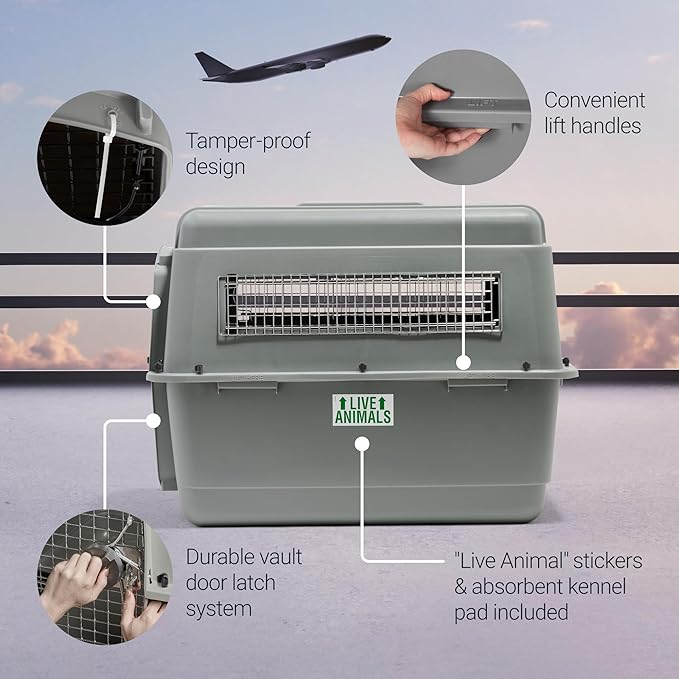 - FIRST-CLASS COMFORT FOR PETS: The Petmate Sky Kennel meets IATA requirements for live animal transport and meets most airline cargo specifications, providing secure air travel for pets; it includes 360-degree ventilation and tie-down strap holes