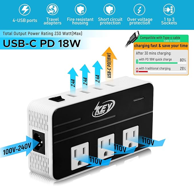 Key Power 230-Watt Step Down 220V to 110V Voltage Converter & International Travel Adapter/Power Converter with USB-C Port 18W - [Use for USA Appliance Overseas in Europe, AU, UK, Ireland, etc.]