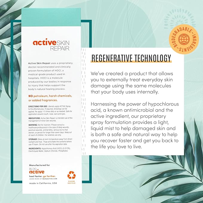 - FIRST AID HYPOCHLORUS ACID SPRAY: The technology used in Active Skin Repair is the same safe and gentle molecule used in hospitals and households worldwide; Hypochlorus Acid cleanse wounds to help skin recover faster