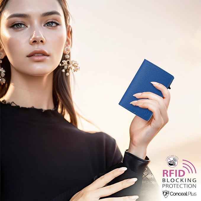 Womens Slim Wallet for Small Purses, Pop Up Wallet with Anti Theft RFID Blocking Credit Card Holder for Women in Navy Blue PU Saffiano