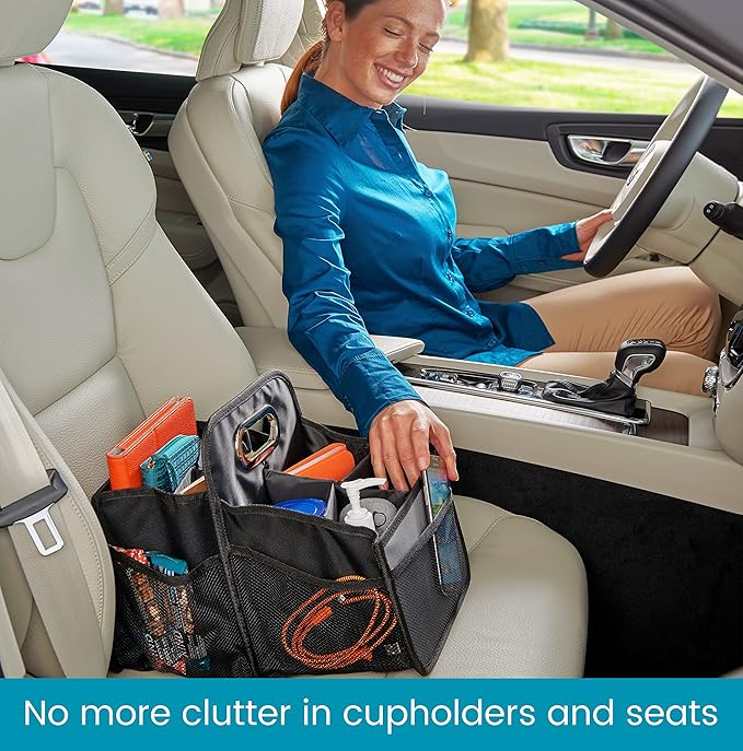 - Car Snack Organizer and Driving Essentials Caddy - 5 outside mesh pockets offer easy-to-see storage for quick access items, inside front compartment has adjustable dividers for cup holder storage, and an open back bin holds tablets, books, bottles and snacks in a convenient tote for car