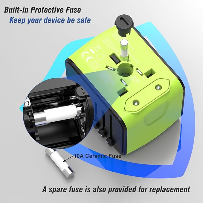- Portable and Safety: This international travel plug adapter is made of high quality flame retardant material, certified by FCC, CE and RoHS etc., safety design:integrated security shutters and separate plug lock system. Built-in 10A Fuse.