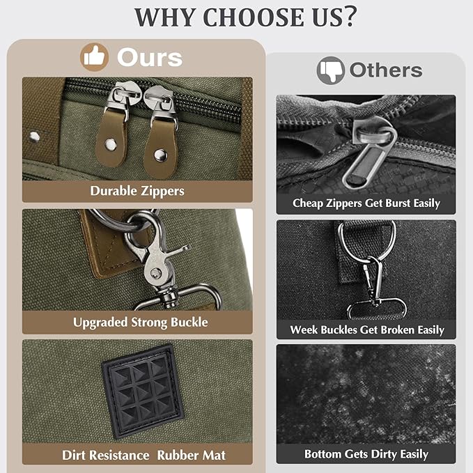 - Multipurpose: Suitable for both men and women, the Canvas Travel Duffel Bag can be used as a weekender bag, overnight bag, short-term travel bag, toiletry kit, camping bag, business bag, gym tote, carry-on luggage, or simply as an emergency bag