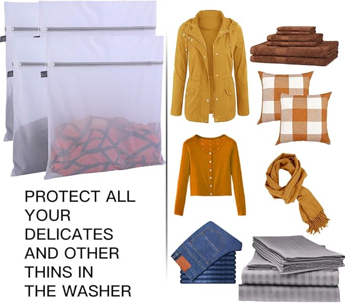 - 【Come in 4 Pieces】XXL Size(24 x 24 inch), perfect for washing coats, heavy clothing, bedding, linens, pillowcases, bed sheets, duvet covers, tablecloths, mattress covers, long dersses, plush toys