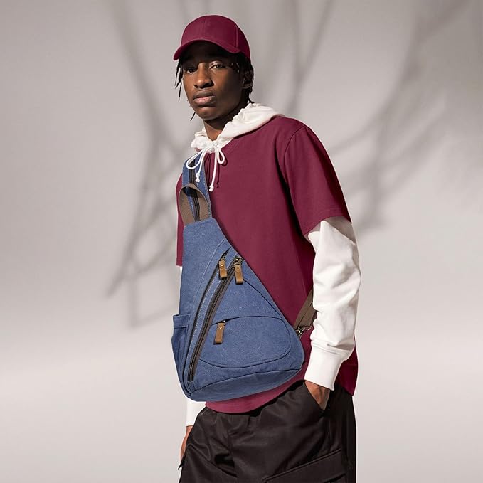 - [COMPACT YET SPACIOUS] Versatile canvas sling bag has plenty of rooms for gadgets, wallet, umbrella, sunglasses, water bottle and small laptop (up to 12.5"), etc. Easy access to small items, perfect for daily use or as a carry on luggage.