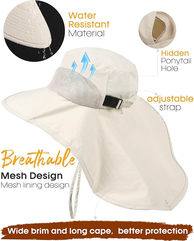 - UPF 50+ Sun Protection: The fishing sun hat blocks 99% of UV Rays.4.7 inch wide brim and extra back coverage,covering and protecting your face,ear and neck much better.Windproof and breathable,perfect for summer outdoor activities hiking