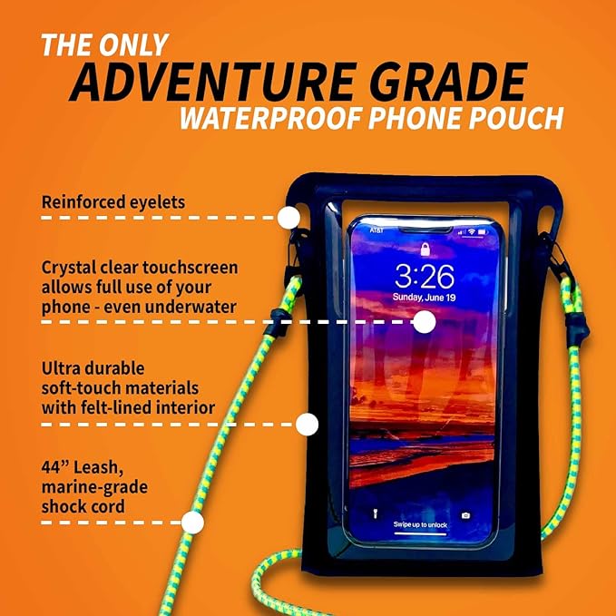 - 44" SHOCK CORD LANYARD: the Stash7 Waterpocket waterproof phone bag features the one and only Stash7 Leash: a rugged 40" UV and abrasion resistant, nautical grade shock cord with a sturdy alloy spring loaded carabiners letting you securely clip, loop or tie your phone pouch in any way you want to your life jacket, belt, backpack, swimsuit, or whatever gear your taking on your next adventure