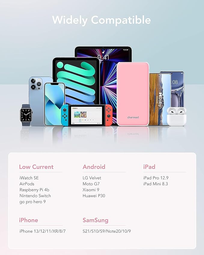 - 🔋【High-Speed Charging】: 25% charging speed faster compared to similar versions on the market. 4 smart USB outputs get the fastest charging by intelligently detecting and regulating the charging current. Provides a total 5.4A output to charge up to 4 devices simultaneously with Charmast battery pack. The versatile USB-C port supports fast input and output. Long-lasting portable charger for iPhone, iPad, Samsung Pixel More