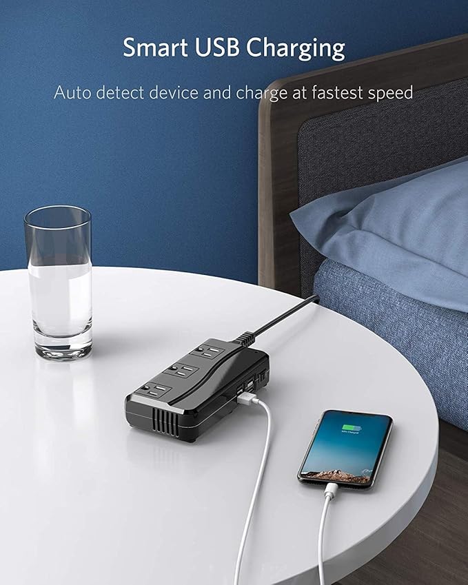 - With 250W output power, 4 usb ports and 3 AC ports, this inverter can charge 7 devices at the same time to meet your various needs for international travel.
