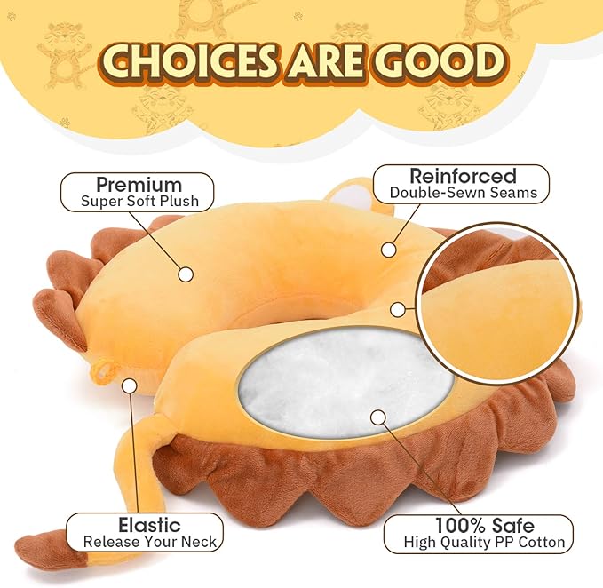 H HOMEWINS Travel Pillow for Kids,Cute Animal Neck Pillow for Boys Girls,Soft Neck Head Chin Support Pillow,Travel Accessories for Airplane, Car, Train,Recline(Lion)