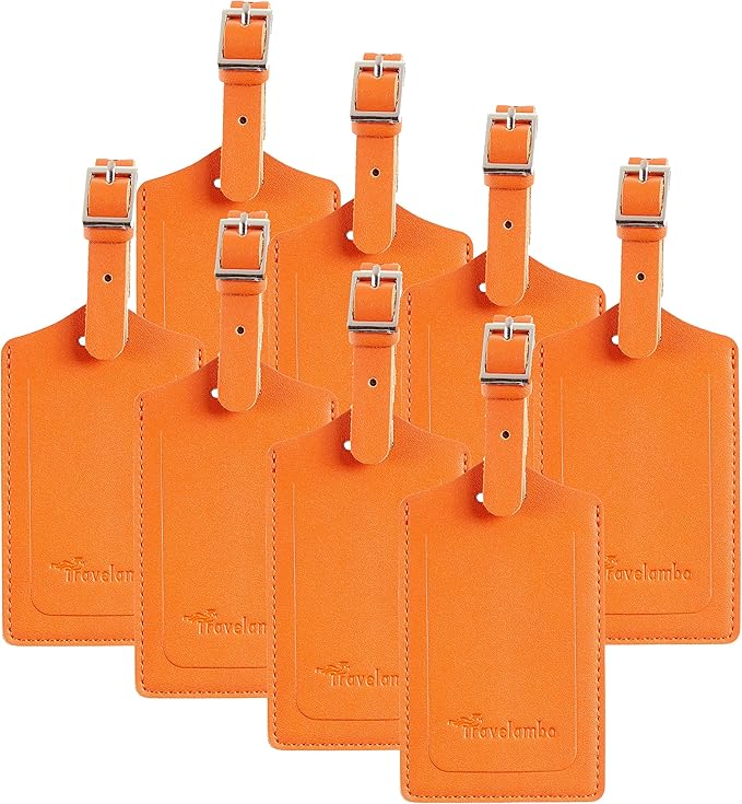 Travelambo 8 Pack Luggage Tags Faux Leather for Suitcases Travel Bag Labels Travel Accessories Essential with Protection Cover ID (Orange)