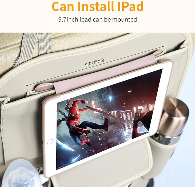 - Special Design, Large Capacity: with 1 pocket for iPad, 2 bottle holders, 2 hooks, 1 tissue box, 1 large storage box, car seat protector is large ans its size is about 17.0 x 23.3in, suitable for all kinds of carseat with a headrest