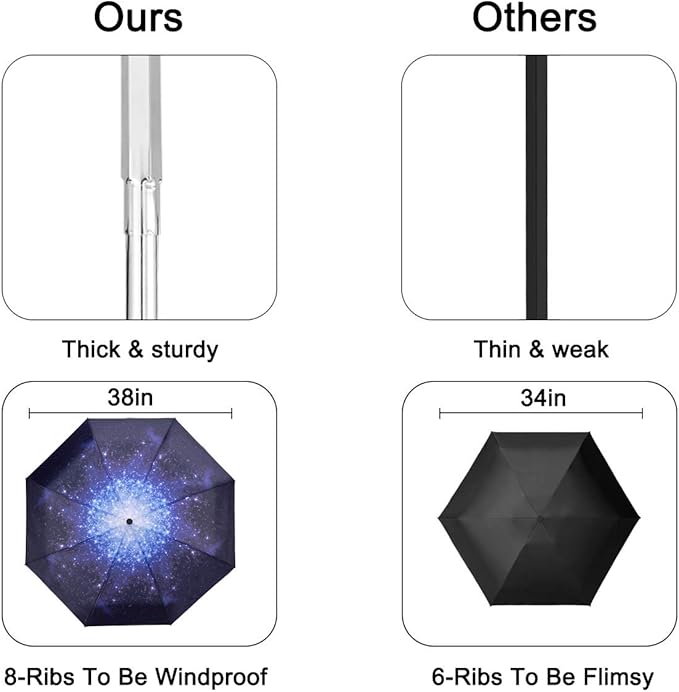 - 【ULTRA MINI & COMPACT TRAVEL UMBRELLA】- This compact umbrella is only 11 oz weight , 8.5 inch length yet open to form a large 38"(not 34") canopy, fitting perfectly in your makeup bag,briefcase,suitcase or backpack. It is also ideal gift for parents, friends, colleagues.