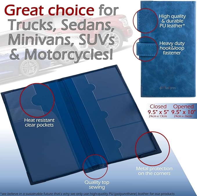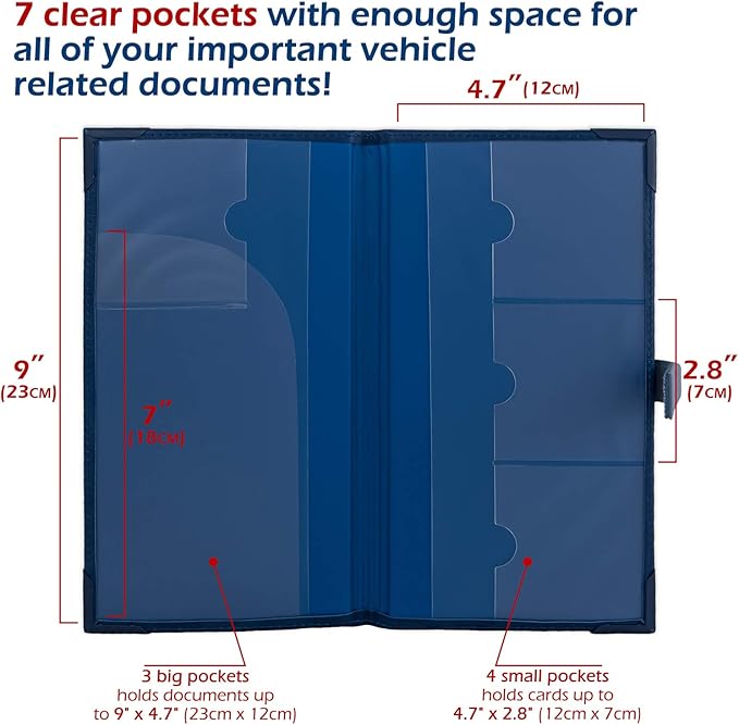 - 7 POCKETS - Enough space for all of your important vehicle-related documents including registration & insurance, business cards, emergency information, roadside assistance, rewards, fuel, and auto club cards, DMV, AAA, MCA.
