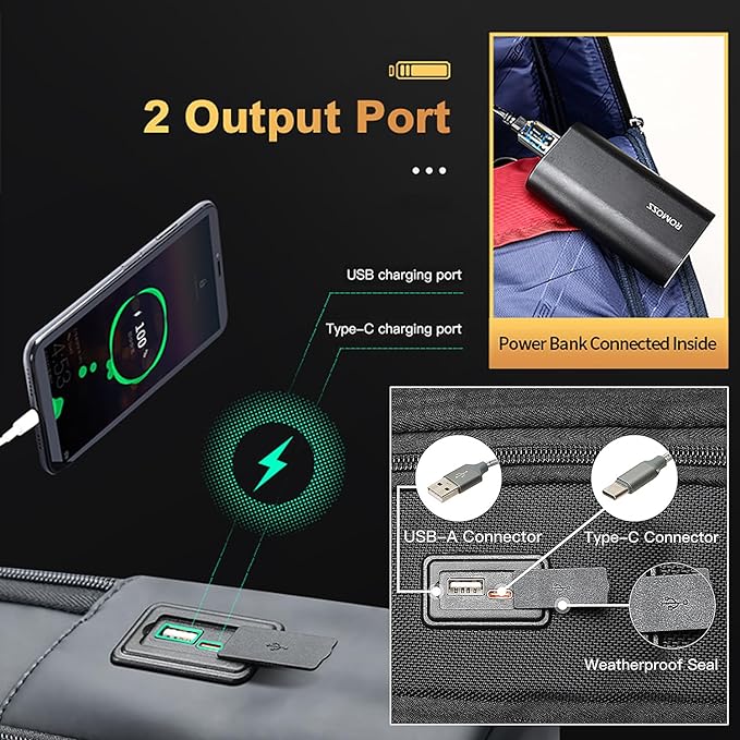 - USB & Type-C Charging Port Design - This backpack with 2 output port outside and the corresponding cable is also provided, which can be connected to a power bank inside the bag.(Power bank not included).