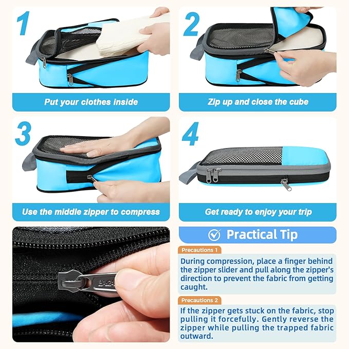 - HOW TO MAKE THE COMPRESSION HAPPEN? - There Is a Extra Zipper Outside Of Our Compression Packing Cubes Which Can Be Zipped Up To Flatten The Cubes And Save The Space As Far As Possible. It Just Works Like a Vacuum Sealer. You Just Need To :1) Fold Your Clothes And Flatten Them 2)Pack Clothes In The Cubes And Zip The Normal Zipper. 3)Put A Finger On The Back Of The Zipper In The Space When Compressing The Packing Cubes In Case The Zipper Get Stuck In Fabric.