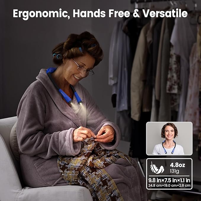 - [Eye Caring & Ergonomic Design] Blue light filter and no flickering design by the advanced LED beads of the Glocusent reading light. Compared with other reading lights for books in bed, you feel no more eye strain with the Glocusent book light. The arms of the reading light around your neck are supple and adjustable so you can get the angle most comfortable for you. This around the neck reading light is ergonomically designed, it is an exceptional handsfree neck lamp for reading!