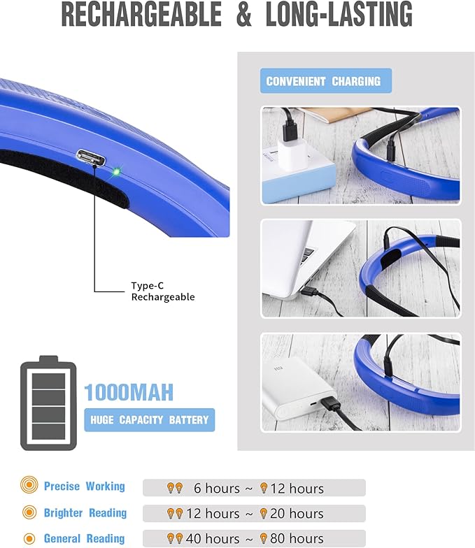 - [Rechargeable & Long-Lasting] This neck reading light rechargeable with USB Type-C which is reversible and therefore easier to plug in compared with other neck lights for crafts charged with Micro-USB. Up to 80 hours (general reading, single head) of powerful, non-diminishing brightness from the included premium rechargeable 1000mAh battery. A long lasting usb rechargeable book light for reading in bed.