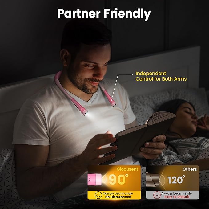 - [Partner Friendly & Versatile] Unlike other book lights for reading at night in bed, the Glocusent neck book light has a special narrow beam angle (90°) design. It is bright enough to illuminate the area you focus on while being dim enough not to disturb your sleeping partner. Additionally, the hands-free feature allows you to engage in various delicate activities such as knitting, walking, repairing, and more. Make it a perfect versatile book light.