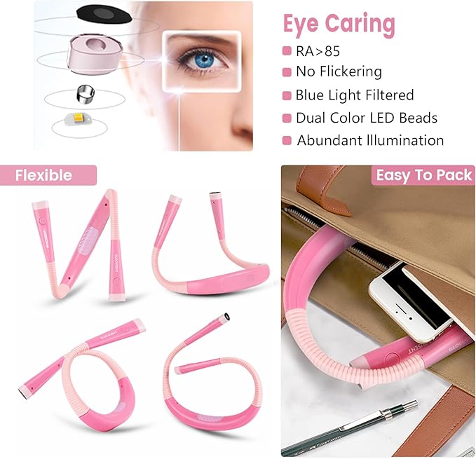- [Eye Caring & Ergonomic Design] Blue light filter and no flickering design by the advanced LED beads of the Glocusent reading light. Compared with other reading lights for books in bed, you feel no more eye strain with the Glocusent book light. The arms of the reading light around your neck are supple and adjustable so you can get the angle most comfortable for you. This around the neck reading light is ergonomically designed, it is an exceptional handsfree neck lamp for reading!