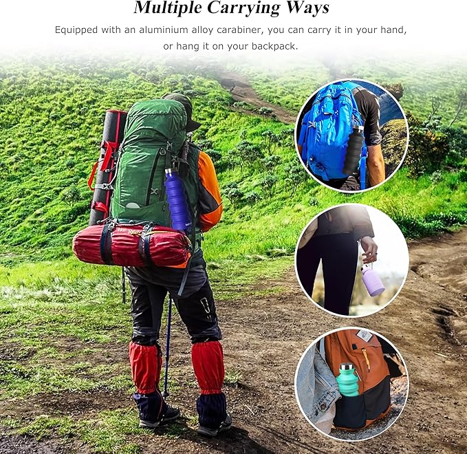 - Portable Design: Collapsible and foldable silicone water bottle with carabiner for travel and sports