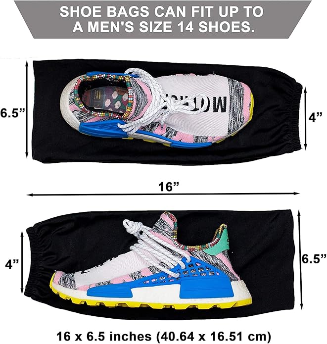 - DESIGNED TO BE SIMPLE: Individual shoe bags help you to maximize your luggage space. These shoe bags are separate pouches. Each shoe can be stored individually, creating a better packed suitcase. Each is 14” x 6”. Shoes fit up to Size 12.