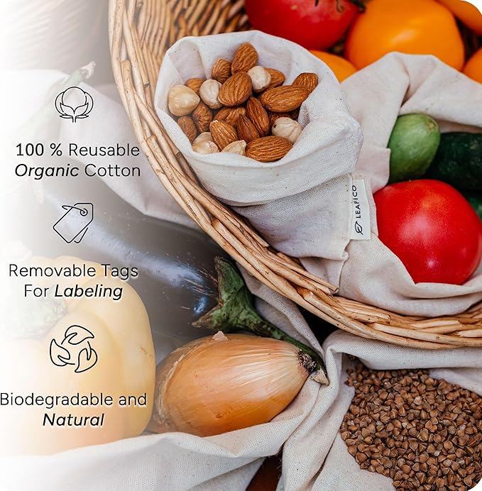 - Eco-Friendly - No more plastic. Use this organic, 100% Biodegradable Cotton/Muslin storage bag with a smooth and delicate fabric, which allows for air circulation. Easy to care for. No toxic chemicals were used while weaving the muslin fabric bags.