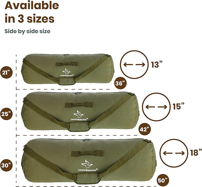 - SPACIOUS MAIN COMPARTMENT: Durable and functional duffle bag comes in 3 different sizes; Standard Size: 36" (Height) x 13" (Diameter) | 21" Flat Width, Large Size: 42" (Height) x 15" (Diameter) | 25" Flat Width, Extra Large Size: 50" (Height) x 18.5" (Diameter) | 30" Flat Width, depending upon your need. It’s large enough to store all your gear and gym accessories for long trips and traveling. This tight woven canvas won't rip or tear apart. Perfect for packing, moving and storing items.