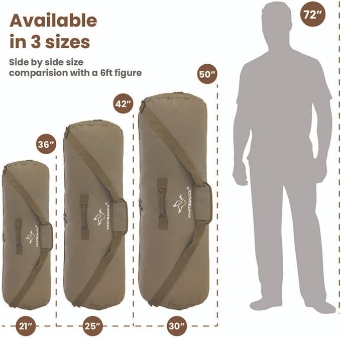 - SPACIOUS MAIN COMPARTMENT: Durable and functional duffle bag comes in 3 different sizes; Standard Size: 36" (Height) x 13" (Diameter) | 21" Flat Width, Large Size: 42" (Height) x 15" (Diameter) | 25" Flat Width, Extra Large Size: 50" (Height) x 18.5" (Diameter) | 30" Flat Width, depending upon your need. It’s large enough to store all your gear and gym accessories for long trips and traveling. This tight woven canvas won't rip or tear apart. Perfect for packing, moving and storing items.