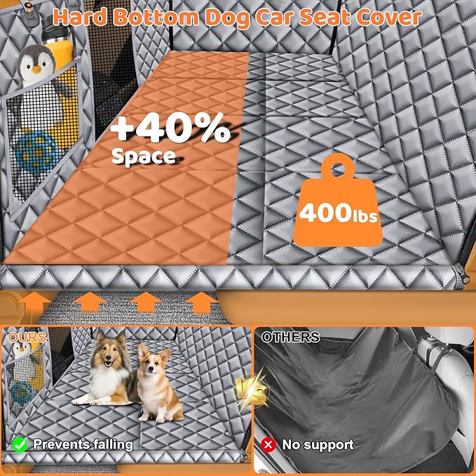 - Hard Bottom Design: The hard bottom dog car seat cover turns the back seat into a dog car bed, which increases 40% secure space and holds up to 400lbs to let your dog easily move around and lay down during the ride