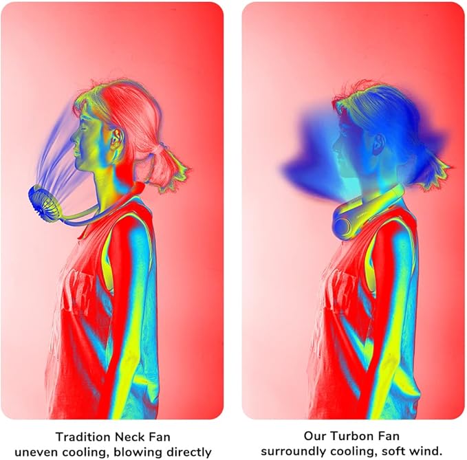 - 【Safety & 78 Air Outlets】 A novel neck fan that can send the wind without waving your hands by simply placing it on your neck. Designed without wings, it can be used safely by children and the elderly. With 78 air outlets around the neck, it can be used for the entire face around, wherever you be in the concert, watching basketball games, work outdoors, crusie travel,air travel, working out in the gym. It can produce enough air to keep you cool always.