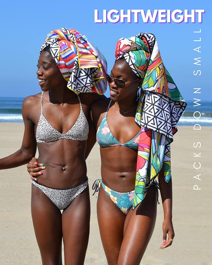 - EXTRA LARGE SIZE YET COMPACT FOR TRAVEL - This beach towel is oversized, providing ample space for lounging. Despite its big size, the travel towel is lightweight and compact taking up minimal space in your beach bag. Easily fits into the included pouch for packing during any vacation.