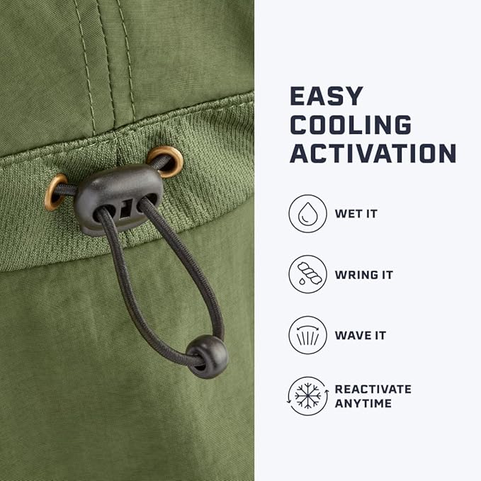 - WATER & SWEAT ACTIVATED TECHNOLOGY: This cooling sun protection hat incorporates advanced Wet-to-Cool Technology, which absorbs water or sweat to cool the hat by up to 30 degrees below average body temperature in under 1 minute. This innovative feature allows the hat to stay cool for up to 2 hours or longer with reactivation. By keeping cool, you can stay focused and dedicated to your activities without distraction. To activate your hat, simply follow these 3 steps: wet, wring, and wave.