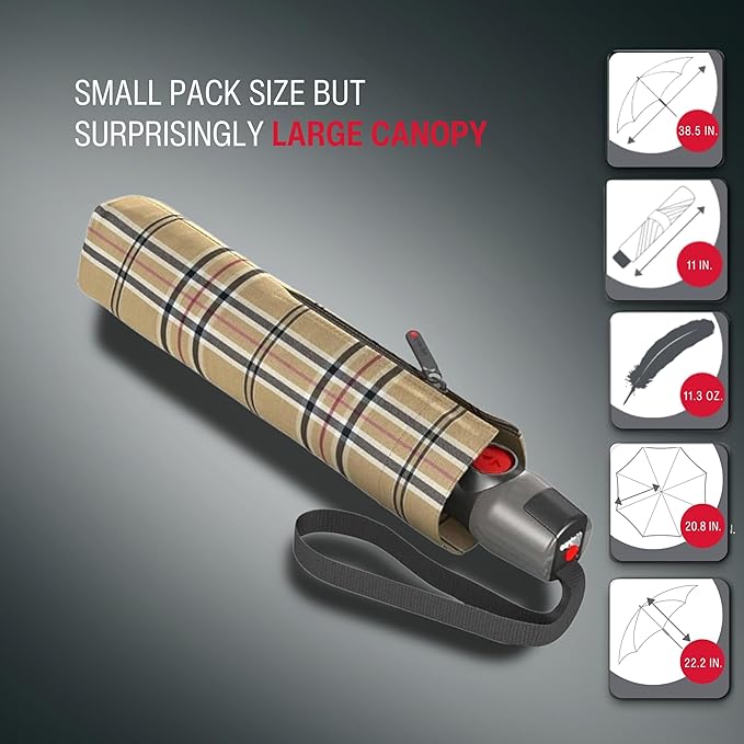 Knirps T.200 Duomatic Compact Rain Umbrella in Check Beige– Wind Tunnel Tested to 93 mph, Aluminum Steel Fiberglass Frame, 38in Canopy, OEKO-TEX, High-Performance Automatic Travel Umbrellas