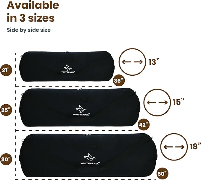 - SPACIOUS MAIN COMPARTMENT: Durable and functional duffle bag comes in 3 different sizes; Standard Size: 36" (Height) x 13" (Diameter) | 21" Flat Width, Large Size: 42" (Height) x 15" (Diameter) | 25" Flat Width, Extra Large Size: 50" (Height) x 18.5" (Diameter) | 30" Flat Width, depending upon your need. It’s large enough to store all your gear and gym accessories for long trips and traveling. This tight woven canvas won't rip or tear apart. Perfect for packing, moving and storing items.