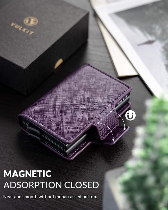VULKIT Credit Card Holder RFID Blocking Leather Automatic Pop Up Wallet Magnetic Wallet Double Card Case for Men and Women