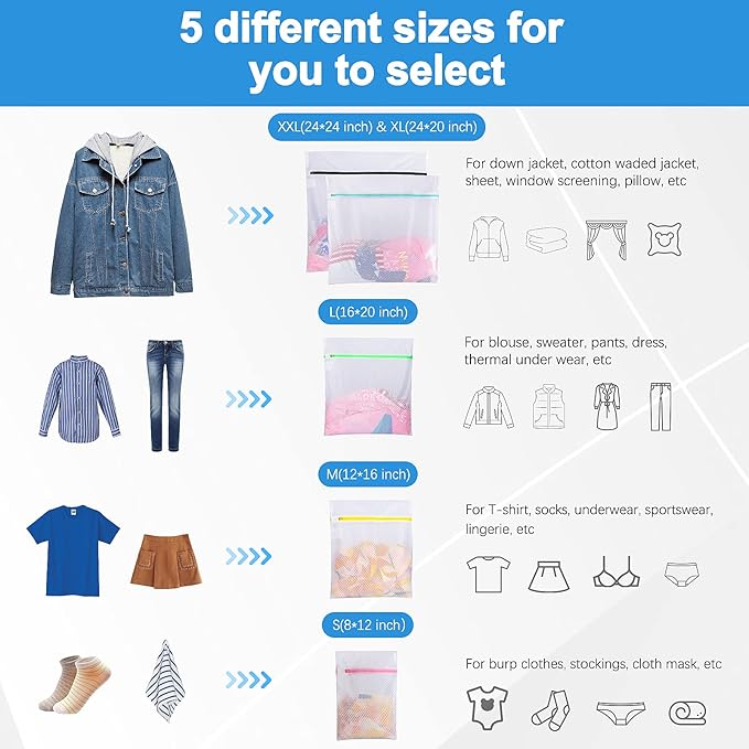 - Set of 5 machine washing bags in different sizes with color-coded zippers for easy selection. Includes 1 Jumbo (24"x24"), 1 XL(20"x24"), 1 L (16"x20"), 1 M (12"x16"), and 1 S (8"x12"). Perfect for laundry, blouses, sweaters, coats, socks, and etc