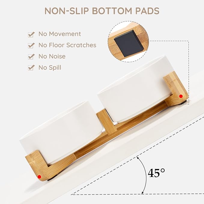 - Double Bowl Design:One dog bowl for food and one for water, Each ceramic cat bowl has a Unique wooden stand, raising the dishes closer to your pet for more comfortable eating