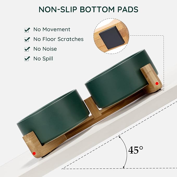 - Double Bowl Design:One dog bowl for food and one for water, Each ceramic cat bowl has a Unique wooden stand, raising the dishes closer to your pet for more comfortable eating