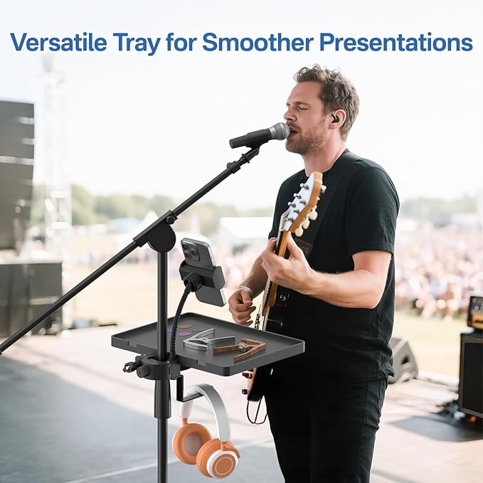 - Hands Free on Stage - This microphone stand tray attachment allows you to quickly access your plectrum, harmonica or check the lyrics or strings on your phone during performance, everything you need is at hand. Freeing up your hands and eliminating the need to frequently bend over to look for things makes for a tighter and more natural flow.