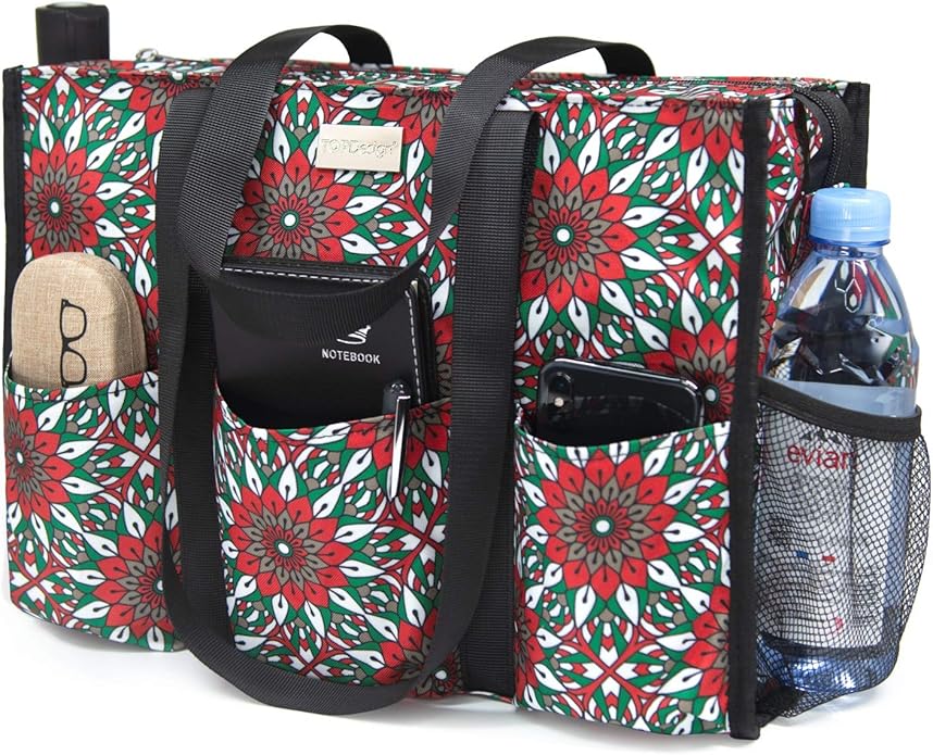 TOPDesign Utility Water Resistant Tote Bag with 13 Pockets, Top Zipper Closure & Thick Bottom Support, for Working Women