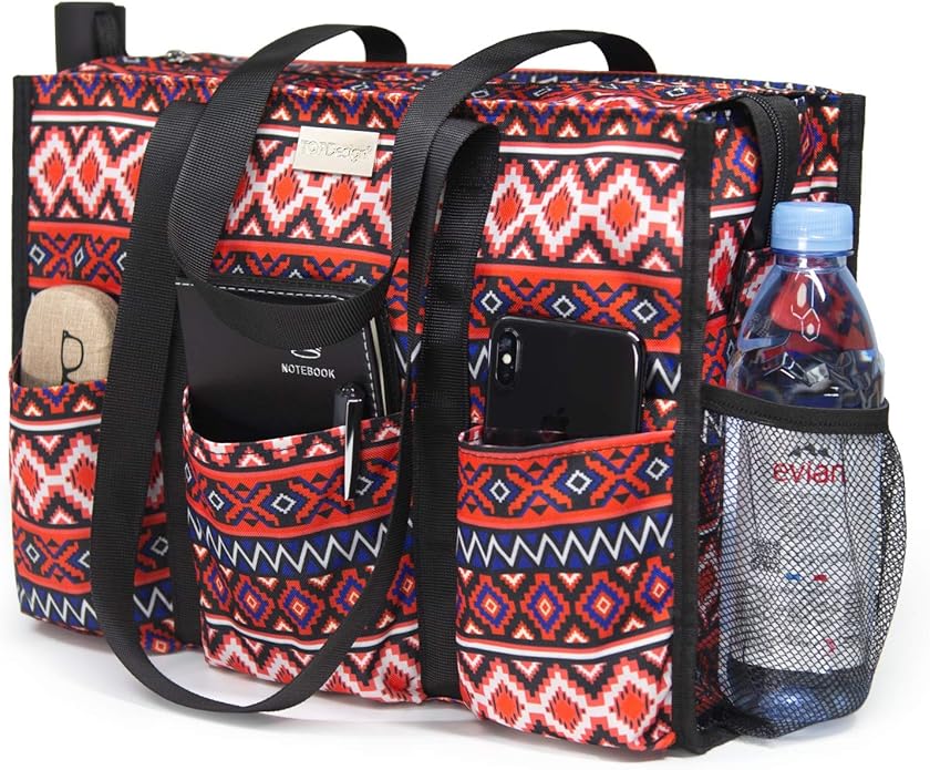 TOPDesign Utility Water Resistant Tote Bag with 13 Pockets, Top Zipper Closure & Thick Bottom Support, for Working Women