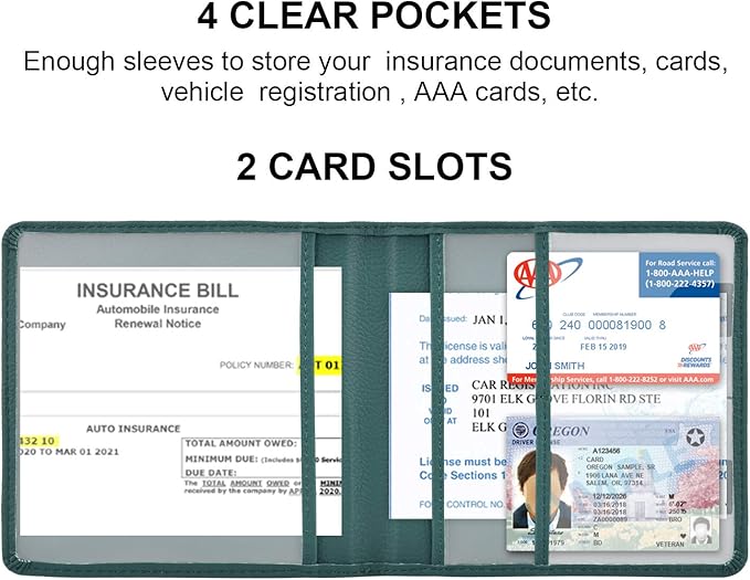 - 4 Sleeves: 2 large pocket for car registration and insurance documents, 2 small pocket for driver's license, ID cards, AAA cards, business cards, receipt, key contact information cards