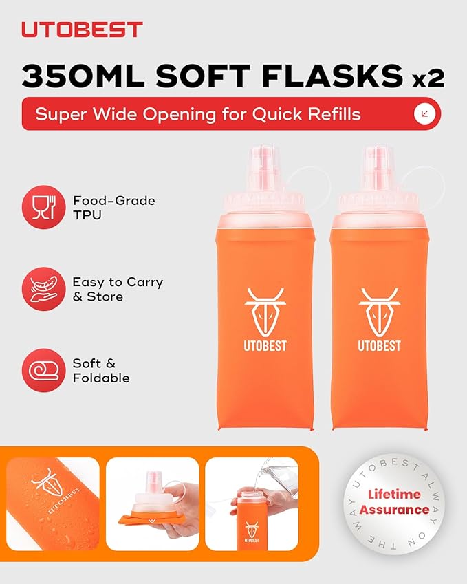 - EQUIPPED with 2 x 350ml SOFT FLASKS: Two 350ml UTOBEST soft flasks made from BPA-free TPU, weighing 45g each. Easy hydration with a wide 42mm cap and bite valve. Collapsible design fits hydration vests comfortably, minimizing bounce. Perfect for running, hiking, cycling; temperature range -20°C to 40°C