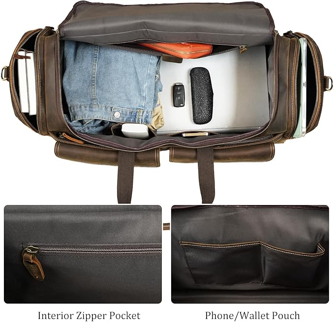 - - 100% Full Grain Cowhide Leather,YKK Zippers. - We use authentic American leather that gains character as it ages. Our Weekender Travel Duffel is made to stand up to whatever you’ll throw at it over the years.