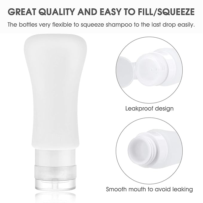 - 【AIRLINE TRAVEL PAL, GREAT OUTDOOR SOLUTION! 】4 x 3oz soft silicon travel containers/bottles, neatly packed in a quart-sized, clear, zippered bag, super convenient to keep your shampoos and lotions organized.4 Pcs pack is great outdoor solution for business or personal travel, camping, hiking, picnic, fun outdoors, gym etc., act and enjoy this amazing value of money!