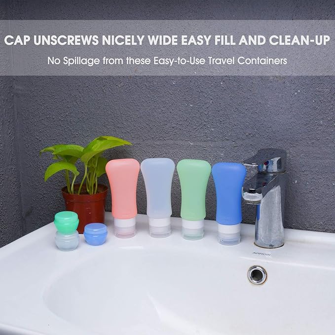 - 【FOOD GRADE SAFETY】These silicone travel bottles are perfect for shampoo, lotion, conditioner, face wash, body wash, sunblock, come with a zippered clear toiletry bag, portable, compact, easy solution to security check-ins. Food grade silicon also suitable for salad dressing, ketchup, mustard etc. in your lunch box.