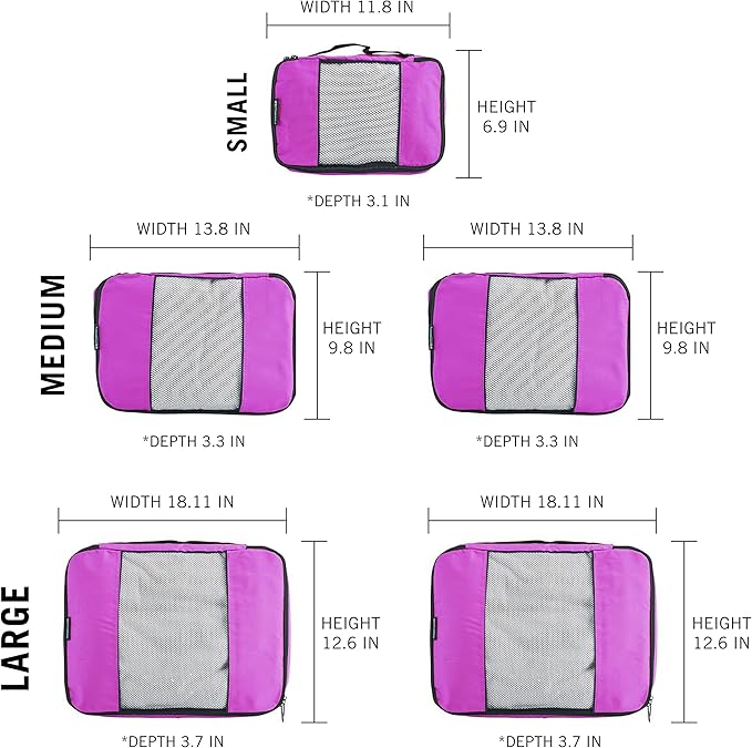 - PACKING MADE EASY – This 5 piece travel organizer set (1 small, 2 medium and 2 large packing cubes) compartmentalizes similar size items in their own “small drawers” to streamline packing and more efficiently utilize interior luggage space.