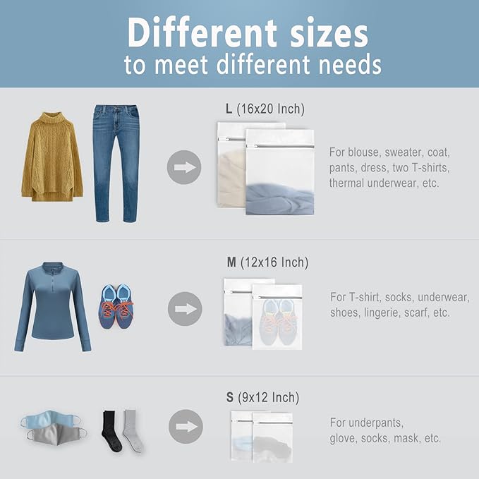 - Large, Medium, Small and extra strong: our 16" x 20" (40 x 50 cm), 12" x 16" (30 x 40 cm), 9" x 12" (23 x 30 cm) laundry bag made of durable material (70g diamond structure mesh) for a long-lasting usage