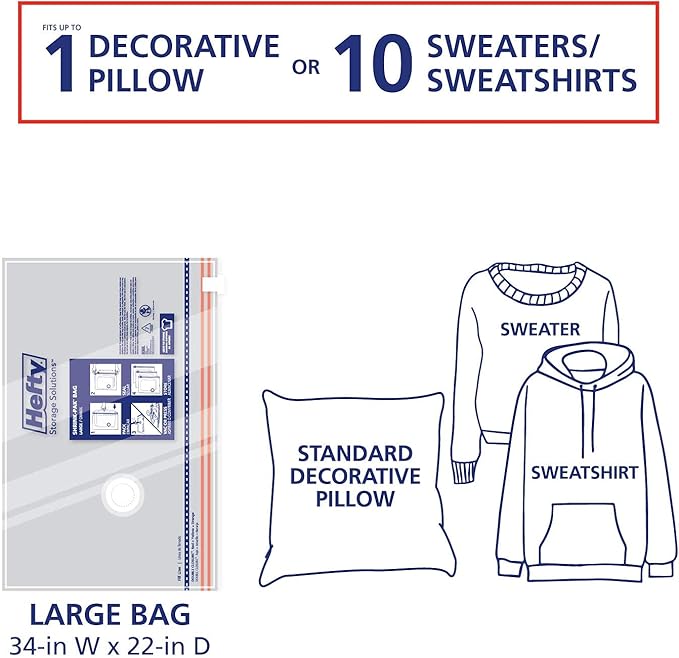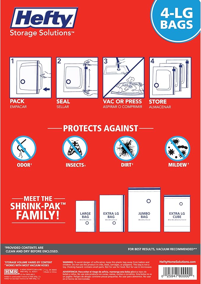 - Space Saving Storage Solution: Hefty SHRINK-PAK vacuum storage bags are the perfect storage solution for seasonal clothing and bedding, offering maximum shrinkage and effectively saving space in your closet, suitcase or under your bed